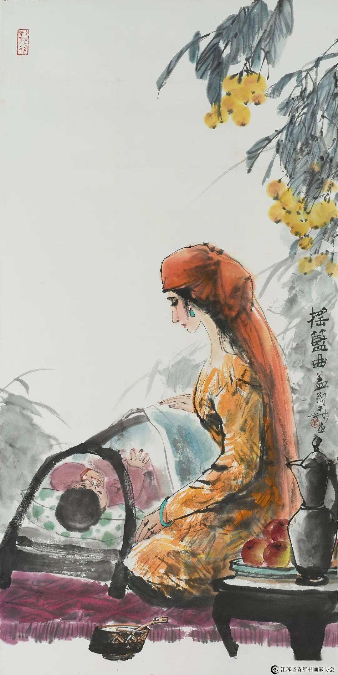 盖茂森几十年的创作历程,是在不断地用笔墨呈现中国人文的时代脉络。他的作品广及革命历史、江南风情、新疆少数民族风情、古代人物四个方面。他不仅熟悉中国人物画传统,而且研习过山水、花鸟画传统,因而他能够在人物画创作中,将线条勾勒法与没骨法、破墨法融为一体,发挥到淋漓尽致;同时他还掌握了西方绘画准确的造型功力和色彩原理,进而巧妙地融入到中国水墨写意体系中,突出了中国画本体“写”的特色。这些正是他的作品耐人品味的重要原因。
