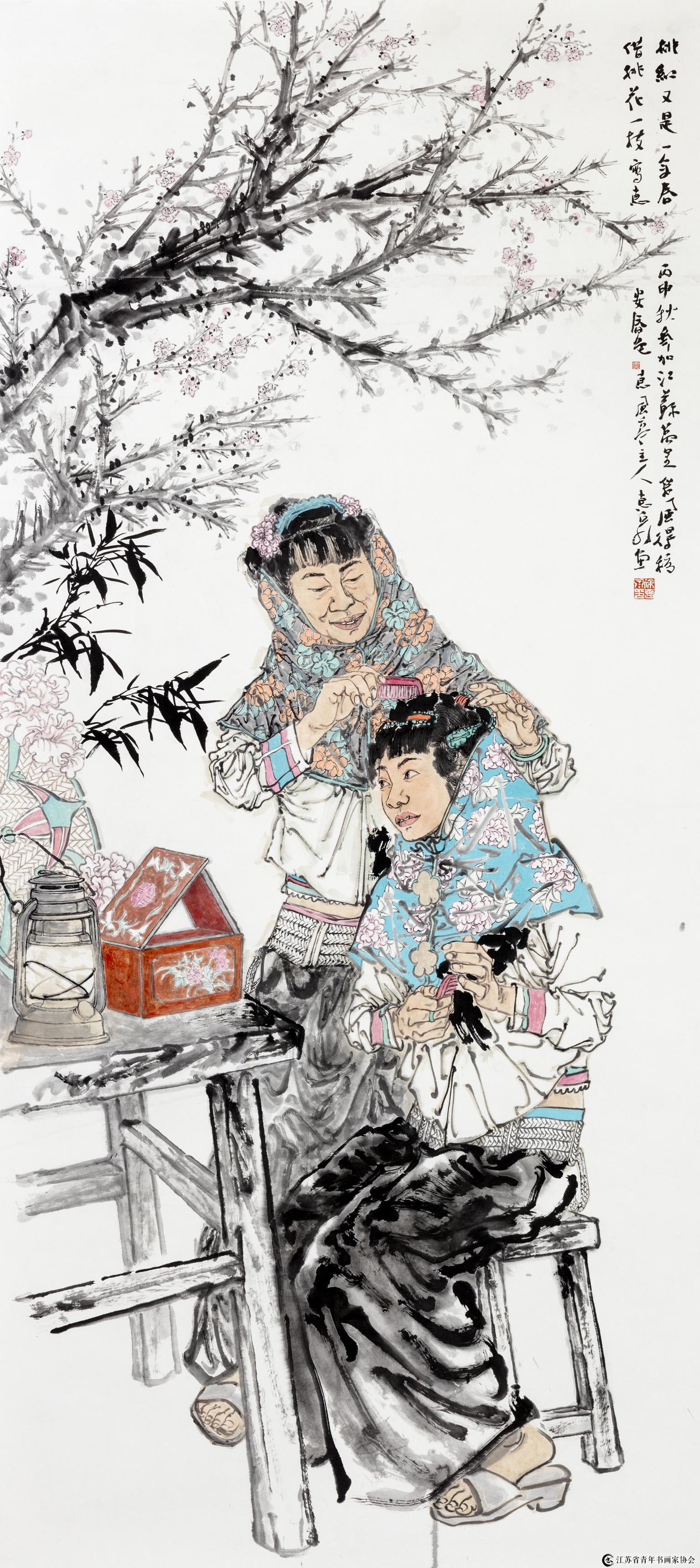 我之所以称徐惠泉的画为“墨彩世界”,是因为在他的画中总体呈现的是水墨氤氲气象。尽管惠泉的画色彩运用比较多,但隐含其中的仍是骨法用笔。从其早期的《荷塘清思》、《春江花月》到近期的《花之梦》、《文学家朱自清》等系列作品,都始终保持这种气息。画中的人物景具都以墨线勾写,皴擦顿挫,爽利明晰,再辅之以浑厚的石色,以色彩来丰润笔墨,以笔墨来彰显色彩,达到“色不碍墨,墨不碍色”,墨色相融互补的艺术效果。可以看出惠泉对于钱选、赵孟頫、文征明、仇英等古代大师墨彩方面的师法借鉴,画面整体呈现出端庄劲秀,淳厚而又不失灵动的艺术品质,隐约透出元人散淡工致的风姿。